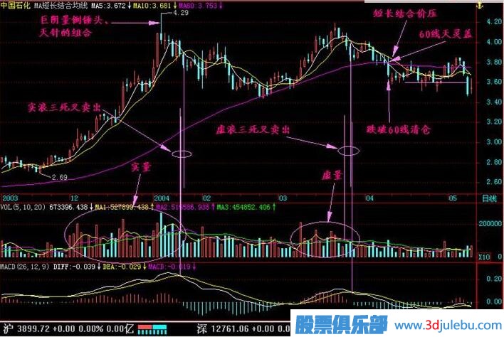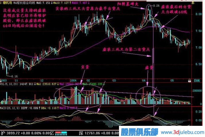(3)當(dāng)實(shí)浪上升到一定高度后,已有不少獲利盤開始出逃,股價(jià)回落。當(dāng)?shù)诙喰星橥聘邥r(shí)并沒(méi)有莊家出力,因此成交量較小。一旦股價(jià)到達(dá)前期頭部區(qū)間時(shí),解套盤和獲利盤雙重涌出,股價(jià)回落。由于沒(méi)有莊家,其跌勢(shì)一路下滑,在60日均線處并不會(huì)形成支撐。一旦跌破60日均線后,則有長(zhǎng)期下跌行情。