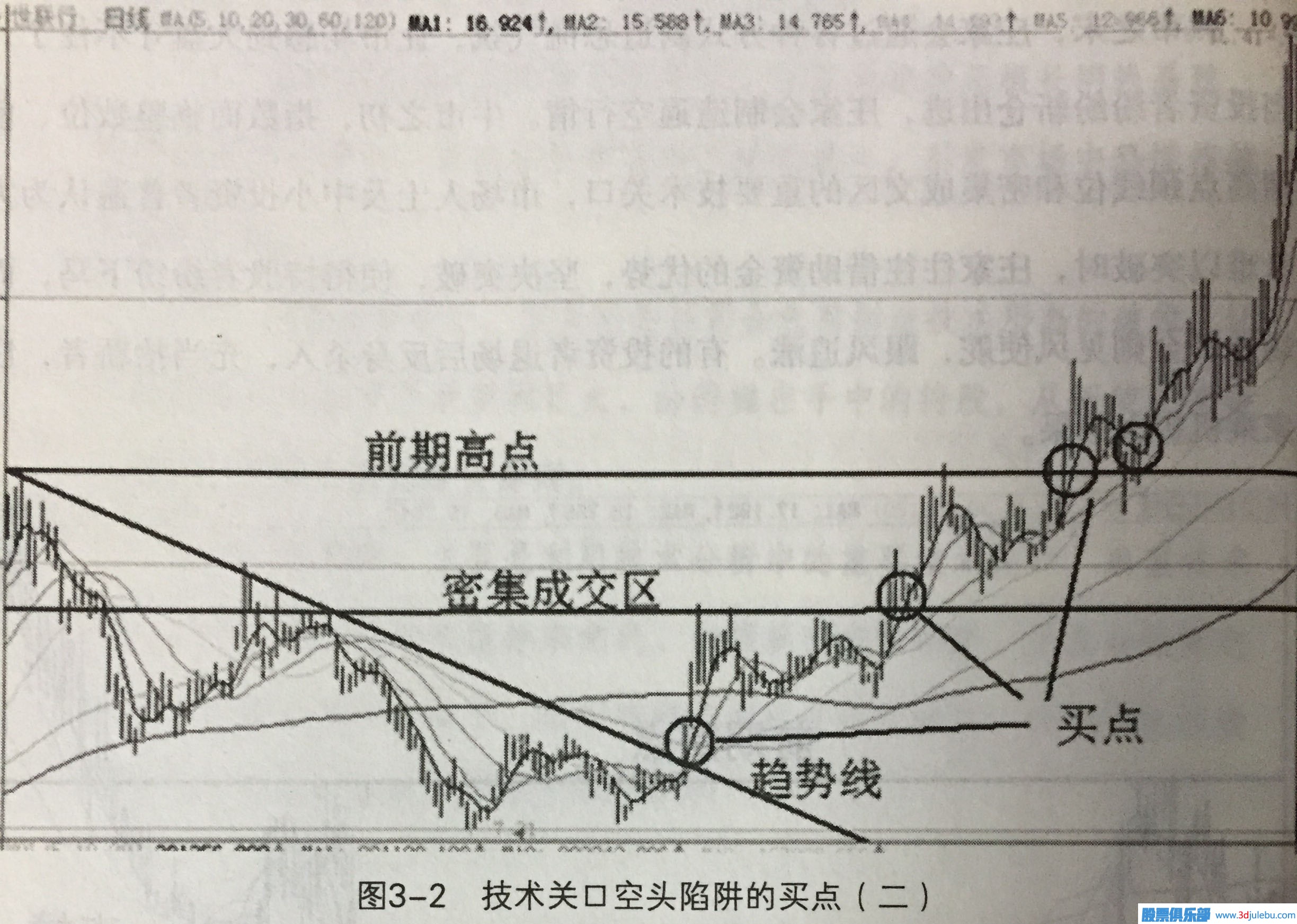 圖3-2是世聯(lián)行2014年1月至12月的K線走勢,股價前期的高點(diǎn)和密集成交區(qū)仍然對股價后期的運(yùn)行起壓制的作用,莊家也是不厭其煩地利用這些技術(shù)關(guān)口一再洗盤。那么散戶朋友在面對這樣的情況下該怎么做呢?在圖中我們增加了一條趨勢線,也把相應(yīng)的買點(diǎn)給標(biāo)出了。擺脫趨勢線的壓制、 股價向上我們視為一個買點(diǎn),此時密集成交區(qū)和前期高點(diǎn)對應(yīng)的壓力線就會成為我們賣出點(diǎn)位的參考。當(dāng)股價突破壓制,這些壓力線又會轉(zhuǎn)變?yōu)?a href=http://www.123cyq.com/jsfx/zczl/ target=_blank class=infotextkey>支撐線, 支撐的有效性又會成為我們買人的參考點(diǎn)。而不同壓力位的價差就是我們的利潤空間。