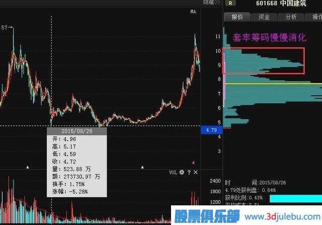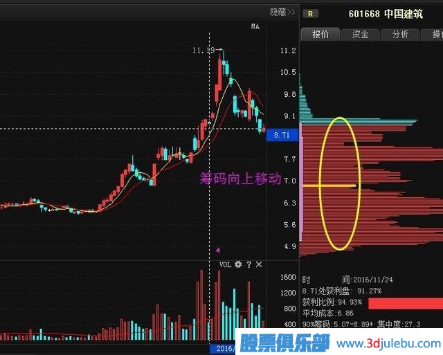 3、拉升階段,股價(jià)不斷的上移,籌碼上移,持有者都是出于獲利階段。