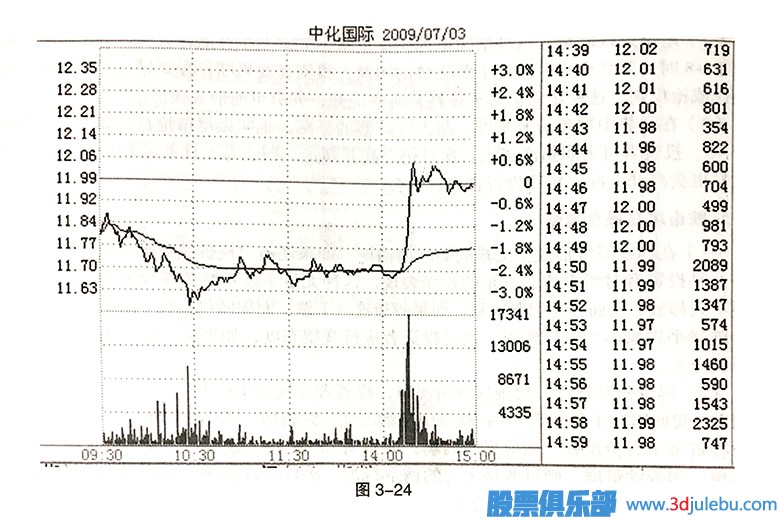 如圖3-24所示,中化國(guó)際(600500)主力在14:00之前讓股價(jià)維持窄幅震蕩,14.00之后,突然用大買單拉高股價(jià),直至拉到漲停。在股價(jià)快速拉高的過(guò)程中,成交量也出現(xiàn)了明顯放大,這說(shuō)明場(chǎng)外資金進(jìn)場(chǎng)比較明顯。如果在行情好的情況下出現(xiàn)這種走勢(shì),第二天股價(jià)一般都會(huì)有一個(gè)沖高,對(duì)于短線投資者來(lái)說(shuō),可以在收盤前進(jìn)場(chǎng)買進(jìn)。如果第二天股價(jià)在沖高的過(guò)程中出現(xiàn)上漲無(wú)力的情況,可以獲利了結(jié);如果第二天股價(jià)穩(wěn)步上漲的話,就可以繼續(xù)持有。