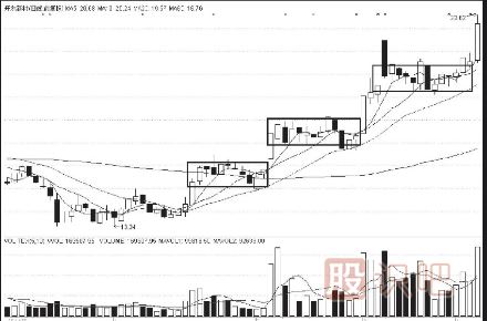 從整體K線形態(tài)上看,就像推土機(jī)作業(yè)一樣,整理橫盤時(shí)間較長(zhǎng),股價(jià)上漲角度較低,但最后漲幅很大。這種建倉方式反映到K線圖上,就是一根陰線后,拉一根陽線,然后再拉2~3根陰線,再拉2~3根陽線,走勢(shì)陰陽交錯(cuò),但股價(jià)慢慢推高(圖8-4)。