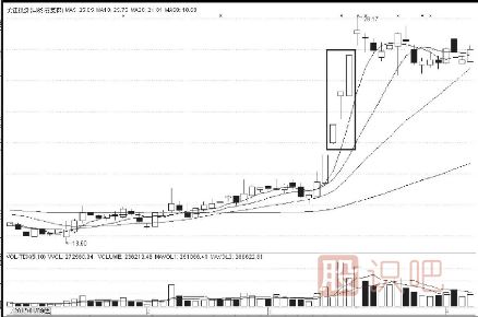 由K線系統(tǒng)研判拉升在拉升階段中,主力經(jīng)常在中高價區(qū)連拉中陽線、長陽線。此時,陽線的數(shù)量往往多于陰線的數(shù)量,陽線的漲幅實體大于陰線的跌幅實體,日k線經(jīng)常連續(xù)收陽,股價時常跳空高開,并且不輕易補(bǔ)缺口,日K線形態(tài)中常出現(xiàn)底部并列三陽線、上升三步曲、大陽K線等。如圖8-9和圖8-10所示。