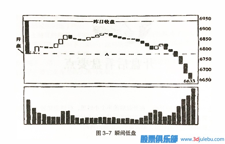 如圖3-11所示,這是一種9:35時指數(shù)不論是以高盤、低盤還是平盤開出,在945時以前股價下跌已經(jīng)超過昨天最低價的情況。