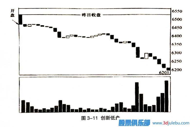 增加,如果成交量萎縮,股價趺破開盤價,此時投資者要賣出;如果行情是以創(chuàng)新高盤開出,但當(dāng)天成交量一直未能有效放大,收盤時極有可能出現(xiàn)殺尾盤的現(xiàn)象。6.創(chuàng)新低盤