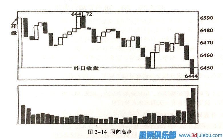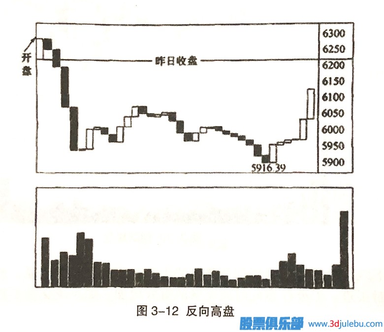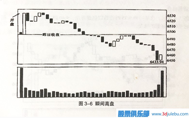 如圖3-8所示,這是一種9:35時指數(shù)以高盤開出,9:40時指數(shù)比開盤價高,但945時指數(shù)卻比9:40時還低的情況。