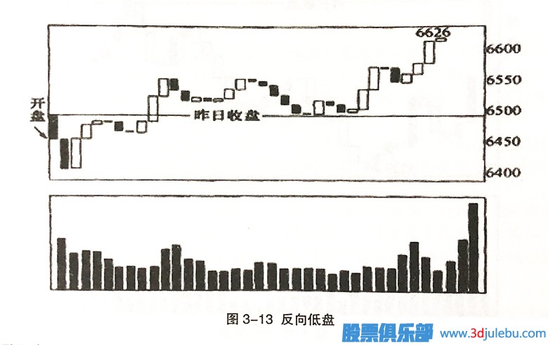 如圖3-7所示,這是一種9:35時指數(shù)以低盤開出,9:40和945時的指數(shù)卻比開盤價還高的情況。