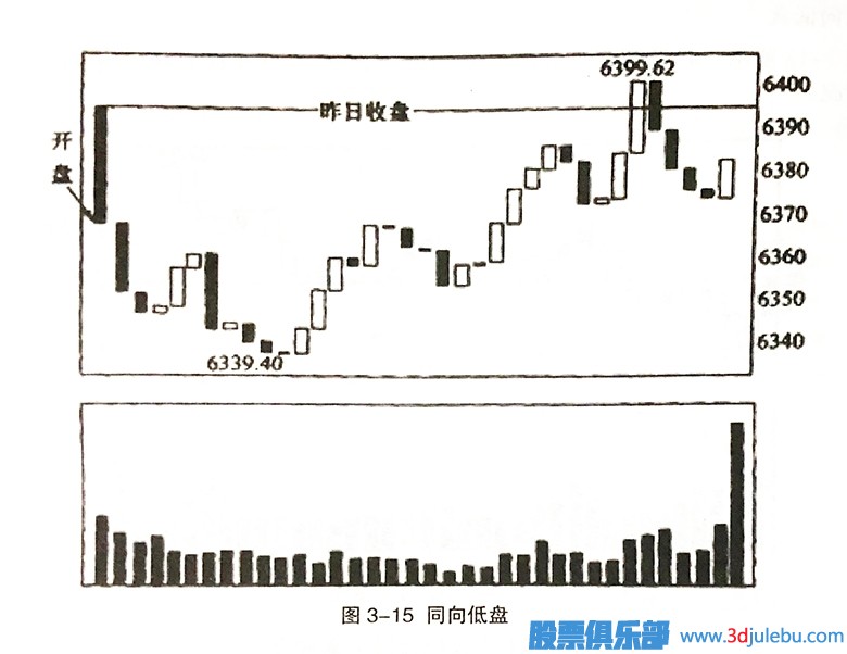 如圖3-9所示,這是一種9:30時指數(shù)以低盤開出,9:40時指數(shù)開盤點(diǎn)低,但9:45時指數(shù)卻出現(xiàn)比9:40時還高的情況。
