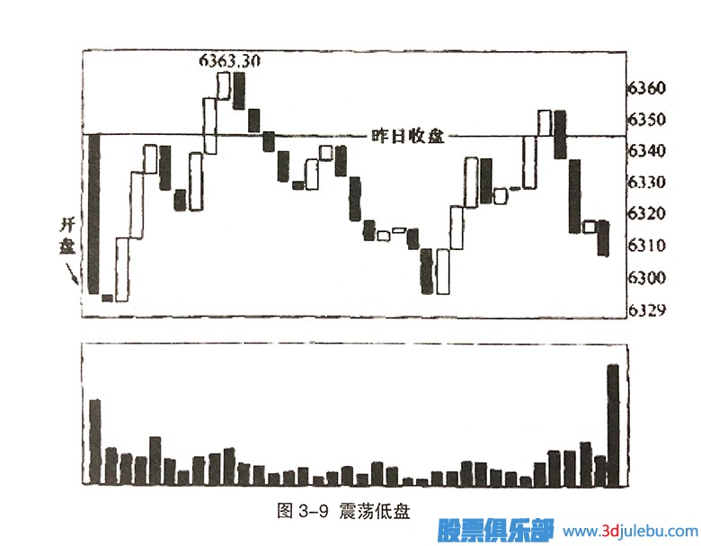 震蕩低盤為多空力量平衡的整理盤。出現(xiàn)震蕩低盤時,當(dāng)天會有兩個以上漲跌波段投資者可以采用高賣低買的短線操作原則來賺取市場差價。在正常情況下,開出震蕩低盤之后,第一次下跌波段的第三波最低點(diǎn)或者第五波最低點(diǎn)附近是理想的買進(jìn)點(diǎn)。