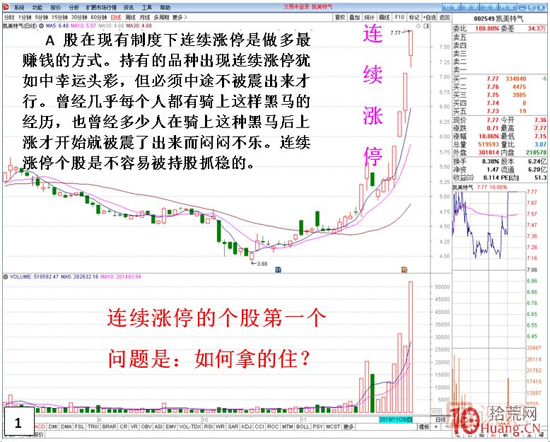 對于專業(yè)買賣漲停品種的,掌握連續(xù)漲停的持股方法那是必須不可少的。買漲停抓漲停有難度,但這并不是做漲停最難的。買到漲停抓到漲停后能拿的住連續(xù)漲停不輕易被震出來才是最難的。因為買漲停能否成功重要于是否能拿的住連續(xù)漲停,不僅