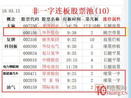 當(dāng)天的2或3連板并且是題材龍頭的票:華升股份大麻的2連板,厚普股份和雪萊特新能源車的2板,油氣國(guó)際實(shí)業(yè)的2板。