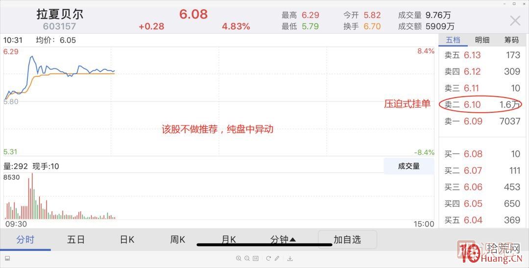 因?yàn)榇藭r(shí)的壓單并不一定是有人在拋空,有可能是主力自己的籌碼。主力在造量,在吸引投資者注意。如果持續(xù)出現(xiàn)賣單掛出就被吃掉,那可反映出主力的實(shí)力。但大家要注意,如果想介入,千萬不要跟風(fēng)追買賣盤。等待大拋單不見了,股價(jià)在盤中回調(diào)時(shí)再介入,避免當(dāng)日追高被套。