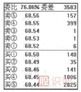 從圖中看出:主力在68.50元掛出140手買單后(其實不止這么點,前面已經(jīng)成交了幾百手)。然后在68.45元和68.44元分別掛出兩個四位數(shù)大買單,中間“跳躍”了68.49、68.48、68.47、68.46四個價位(注意,68.49的35手買單和68.46元的141手買單是散戶的掛單,不是主力的掛單),其中68.48和68.47兩個價位無任何掛單,就是說連散戶的掛單也沒有。這是因為主力根據(jù)市場喜歡在整數(shù)位掛單的習(xí)慣,故意在非整數(shù)處68.44元掛出2825手買單,以起到接盤的烘托作用。