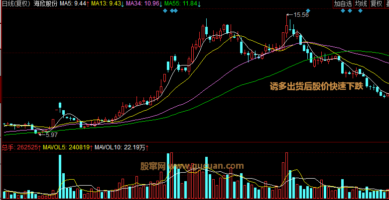 如果你在放巨量的第一天跟進,那第二天出場還存在著一定的盈利機會,這就是前面提到過的超短線機會,但這似乎是在刀口舔血,因為此時主力手中的籌碼已經(jīng)所剩無幾,無力也無心再關(guān)心股價的走勢,他們唯一關(guān)心的是如何將手中的剩余籌碼輸送給散戶,因此短線股價繼續(xù)拉升明顯就是為了出盡手中的剩余籌碼,這就注定是一個短命行情,隨后股價必將步入綿綿無終日的下跌,上圖已經(jīng)可以證明這點,可見此時跟進是一個非常不明智的行為,建議操作上盡量回避看來是正確的。