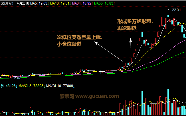(2)個股在次低位突然出現(xiàn)巨量,且股價出現(xiàn)明顯拉升,遇到這種情況建議操作上采取小倉位快速跟進,因為此位置的巨量拉升往往預(yù)示著股價即將進入主升浪,股價將快速上漲。小倉位跟進后如果繼續(xù)放量上漲,則可大量跟進甚至全倉殺入,待股價上深趨勢減緩或開始出現(xiàn)走軟痕跡時全倉離常