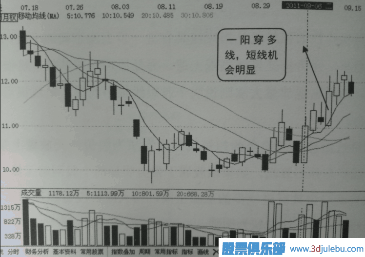 如圖2所示,該股在9月6日當(dāng)天出現(xiàn)放量一陽穿多線的特征,說明短線機(jī)會明顯,當(dāng)天尾盤可伺機(jī)跟進(jìn)。結(jié)果該股在9月6日之后股價(jià)進(jìn)一步上漲,且上漲幅度不小,如果跟進(jìn)短線收益理應(yīng)不菲。