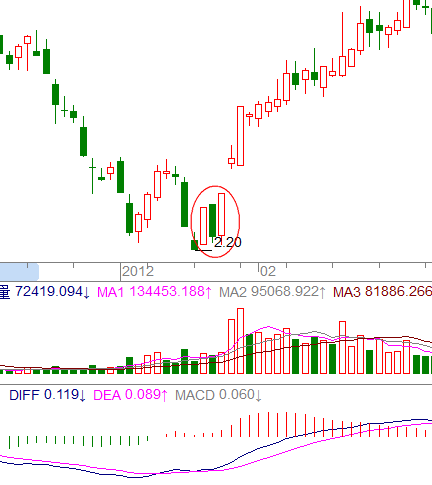 上圖的最后三根K線中,前兩個(gè)陰線可結(jié)合成為一個(gè)跌停板,最后一個(gè)漲停板,即跌停(地)漲停(天)板。
