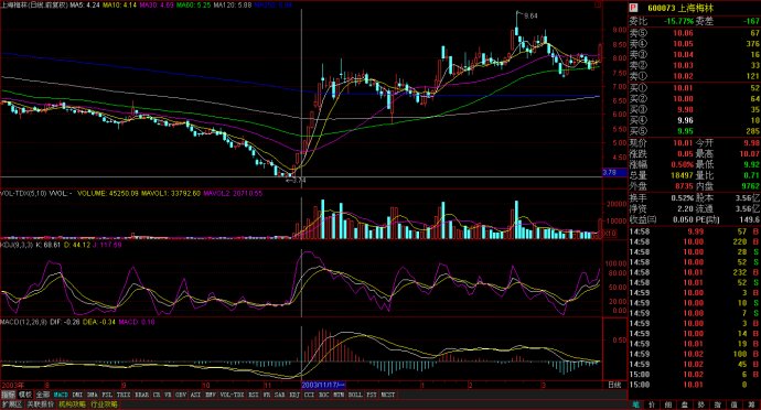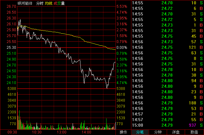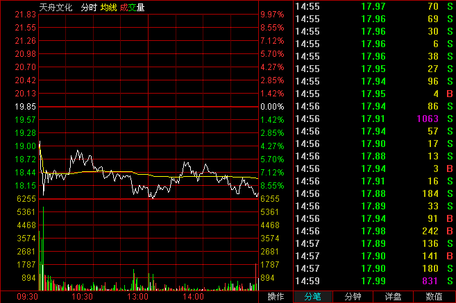 破位大陰線分時圖:開盤低開低走。然后全天保持箱型震蕩,收盤幾乎收在全天最低價。兩個細(xì)節(jié)引起注意:尾盤出現(xiàn)了一個大買單;最后一分鐘收盤價從17.9收到了17.99元。