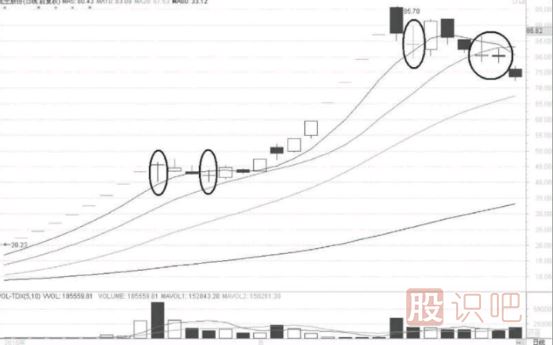 當(dāng)股價(jià)經(jīng)過(guò)一段上漲的行情之后,或者是當(dāng)股價(jià)處于逐步攀升的過(guò)程之中,經(jīng)常會(huì)出現(xiàn)十字線,而且在這個(gè)過(guò)程中成交量不但沒(méi)有放大,反而出現(xiàn)了明顯萎縮(見(jiàn)圖3-27)。有些個(gè)股在上漲的過(guò)程中,還會(huì)連續(xù)出現(xiàn)這種K線形態(tài),同時(shí),股價(jià)也徘徊不前。