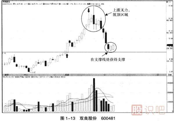 (4)股價在下跌到支撐線處得到有力的支撐。