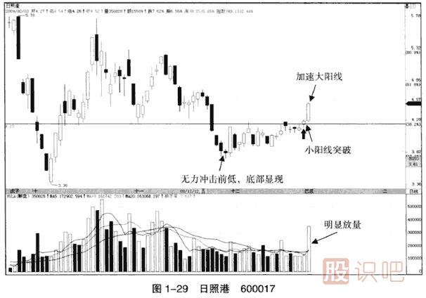(6)如果加速看漲大陽線出現(xiàn)在下跌趨勢中,應密切關注,準備迎接底部的到來。