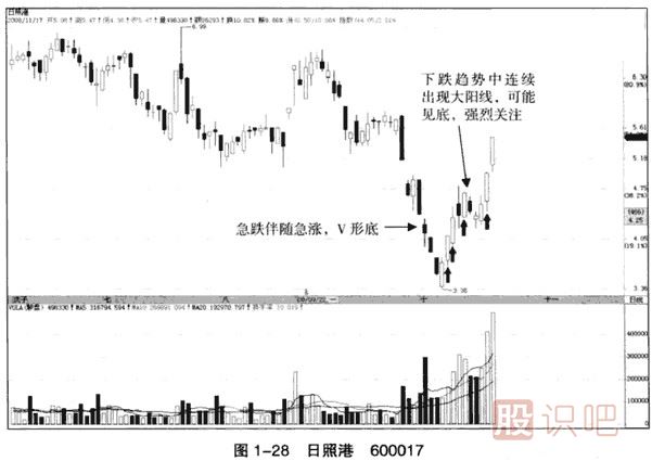 (1)圖1-28是日照港(600017)2008年7月10日至2008年11月17日的日線圖。