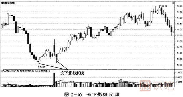 錘頭線K線的特征為K線實(shí)體很小,一般無上影線(即使有,上影線也很短),但下影線長(圖2-11)。