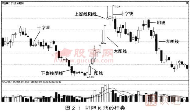 單一K線分陽(yáng)K線和陰K線。陽(yáng)K線即收盤價(jià)高于開盤價(jià)的K線;陰K線即收盤價(jià)低于開盤價(jià)的K線。(如圖2-1)