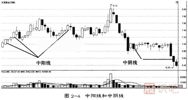 比小陽(yáng)線與小陰線的實(shí)體再放大些的是中陽(yáng)線與中陰線,其開盤價(jià)與收盤價(jià)的波動(dòng)范圍更大(如圖2-4)