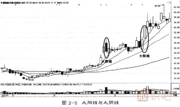 大陽(yáng)線與大陰線的K線實(shí)體較中陽(yáng)線與中陰線更長(zhǎng)。較低價(jià)開盤后一路上升,并以全天較高價(jià)收盤,就可以有較短的上下影線存在,但在整體感覺上其較短的上下影線可忽略,陽(yáng)線實(shí)體巨大,稱為大陽(yáng)線(圖2一5)