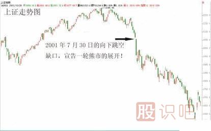 例如:2001年7月30日,大盤以2056點跳空9點低開,并且留下一根實體達100多點的大陰線,宣告一輪大熊市的展開。(見下圖)