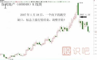再如600048保利地產(chǎn),在2007年1月18日留下了一個向下的突破缺口,標志著一輪調整行情的開始。(見下圖)