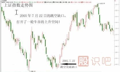 例如,2005年7月22日,上證指數(shù)以1026點跳空高開,并且當天大漲2.52%,迅速脫離1000點這個“危險”的整數(shù)關口,其后一輪轟轟烈烈的大牛市就此展開。如圖: