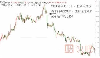 再如,上海電力(600021)這只個股在2003年10月29日上市后,一路震蕩上揚,走勢極為穩(wěn)健,但在2004年4月16日這天,突然間大幅跳空低開,留下了一個向下的突破缺口,使前期連續(xù)五個交易日的7.80元附近的支撐位立刻變成阻力位,而在7.80元附近買進的投資者根本來不及反應,便已被深套。此后,該股股價一路單邊下跌,一直到跌破上市當天的最低價。(見下圖)