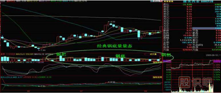 6、鍋形底末端,量能連續(xù)放大,對(duì)應(yīng)K線(xiàn)為U形、圓弧形z或W底更佳。