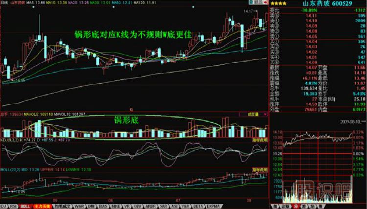 2、鍋形對(duì)應(yīng)的K線(xiàn)形態(tài)為不規(guī)則較淺的w底,量形合一;