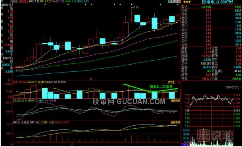 4、如何鑒別縮量為強(qiáng)勢調(diào)整的縮量而不是階段性的出貨,主要是看,其縮量時的均量或最低量是前期放量的1/5或者1/7,定義為縮量二次探底成功,而后期再行放量是縮量的2一5倍最為理想。