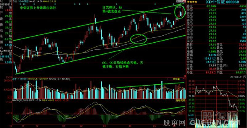 趨勢投資是投資理論的最最重要核心,是技術(shù)分析要駕馭和把握的對象。上升或下降通道就是最常見的趨勢之一。目前我們觀察到很多個股處在開往春天列車的上升通道內(nèi),用通道理論挖掘潛力股是捕捉前期滯脹的尤其一些藍籌較好的實戰(zhàn)方法。結(jié)合中信證券(如圖)進行分析: