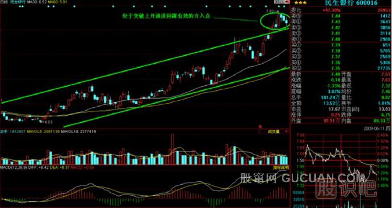 3、突破回踩有效。突破后,股票價格會自然回落,重新回到原來的上升通道的上軌附近,這個過去的阻力線現(xiàn)在變成了一個支撐。當不破原通道上軌,並且準備反身向上的時候,是一個突破買點更安全的買點。這就是回踩確認有效的介入點。