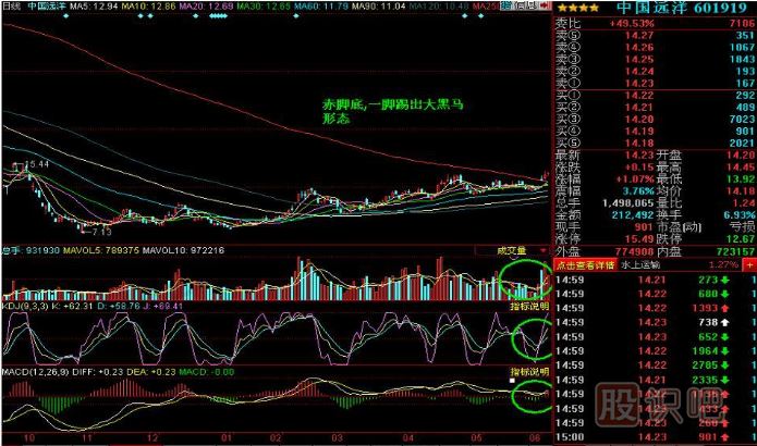 1.股價持續(xù)下跌半年或一年以上,跌幅50%一60%乃至70%以上,赤腳底有其形成機(jī)理。莊家往往在下跌后期有一個加速趕底的動作,快速跌到底部后就形成了腳跟,因?yàn)榭焖傧碌笥?a href=http://www.123cyq.com/GPRM/sy/1792.html target=_blank class=infotextkey>反彈,反彈到中長期均線(在此處一般指的是60日均價線,也可半年線或年線)處必然遇阻回落,之后股價在中長期均線的壓制下逐步走低,此時的中長期均價線就像腳背,股價的回落能夠不創(chuàng)新低,最后股價的活動空間越來越小,如果曾有莊家在足部區(qū)間建倉的話,此時往往會放量突破各種均線(從腳趾上飚起)而走出一段上揚(yáng)行情。赤腳底的關(guān)鍵是腳下一定要放量,而且最好是底部逐漸抬高,這樣才是健康的腳,底部都不抬高的,那就不是赤腳底了,可能演變?yōu)閳A底等其它形態(tài)了。量是關(guān)鍵點(diǎn),量縮放要有規(guī)律,除了腳底要有量,還有突破腳趾頭時也要放量,還有一個關(guān)鍵點(diǎn)就是股價盤整到腳趾頭那個位置時必須各種中短期均線平收斂存一起,那才是最有力的腳趾頭,只要有量的配合就容易飆升。