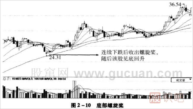 當(dāng)股價(jià)經(jīng)過(guò)一段時(shí)間的下跌之后,出現(xiàn)螺旋槳K線,意味著股價(jià)很可能即將見(jiàn)底,這是一個(gè)看漲的信號(hào),投資者遇到這樣的K線可以適當(dāng)買入,待漲勢(shì)形成,就可以繼續(xù)追加投入。如圖2-10所示