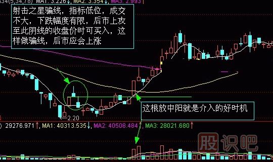 射擊之星通常出現(xiàn)在頂部,當(dāng)大市已有一段升幅之后,一旦出現(xiàn)射擊之星,往往預(yù)示著大市可能反轉(zhuǎn),準(zhǔn)確性較高。當(dāng)射擊之星出現(xiàn)在底部時(shí),此形態(tài)就叫倒錘頭線(xiàn)。因此,在底部倒錘頭線(xiàn)出現(xiàn)在時(shí)是良好的買(mǎi)點(diǎn)(做多),而在頂部出現(xiàn)射擊之星則是良好的賣(mài)點(diǎn)(做空)。