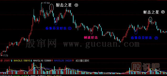 6.理想狀態(tài)是射擊之星次日是向下跳空的長(zhǎng)長(zhǎng)的陰線(xiàn)并深入射擊之星前K線(xiàn)的實(shí)體。