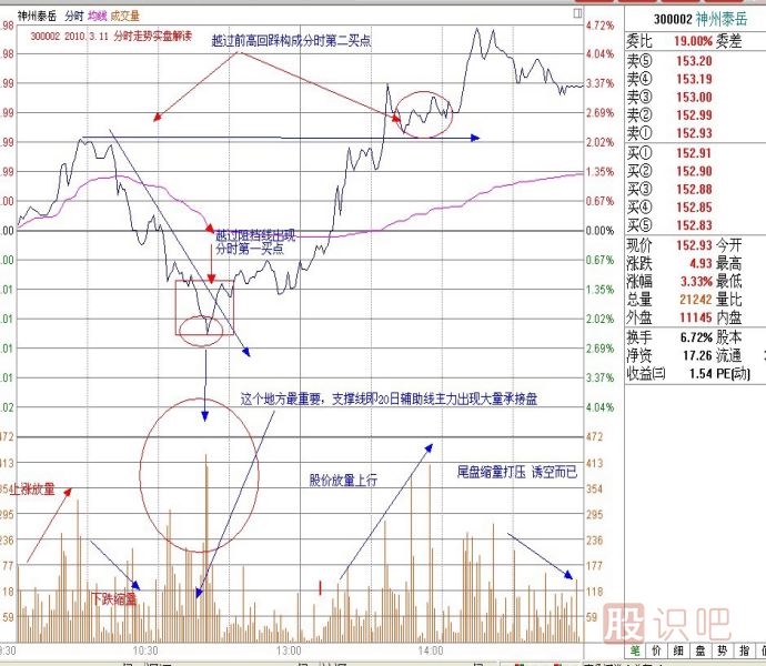 技術(shù)分析不是那么簡(jiǎn)單,不是讀讀波浪理論、搞搞江恩理論,然后再弄幾個(gè)技術(shù)指標(biāo)就算技術(shù)高手了,能在第一時(shí)間對(duì)股價(jià)走勢(shì)進(jìn)行精準(zhǔn)打擊,就必須對(duì)分時(shí)的量能結(jié)構(gòu)和具體的微細(xì)的盤口細(xì)節(jié)具備相當(dāng)?shù)恼J(rèn)知和解讀能力,下面是我今日(2010.3.11)實(shí)盤講解時(shí)對(duì)300002分時(shí)盤口的解讀,這是如何在第一時(shí)間對(duì)買點(diǎn)進(jìn)行精準(zhǔn)撲捉的實(shí)盤運(yùn)用,希望大家都好好看看,很多東西會(huì)在以后操盤中會(huì)周而復(fù)始的出現(xiàn),我們來看下面這幅圖: