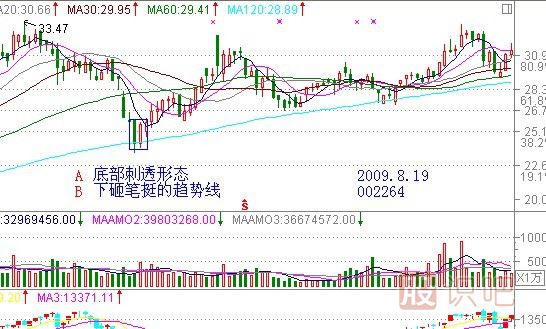 刺透形態(tài),又稱斬回線形態(tài)、旭日烘底、刨根問底,叫法挺多,本來想用刨根問底來命名,后來想想炒股是一門嚴(yán)謹(jǐn)?shù)目茖W(xué),和趙本山的小品不能混為一談,我們還是用個(gè)嚴(yán)肅的名字。