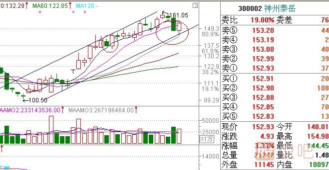 對(duì)刺透形態(tài)的運(yùn)用不僅限于長期底部,而且適用于股價(jià)的調(diào)整階段,在底部形態(tài)(一)啟明星篇中說過300002神州太岳,那時(shí)股價(jià)近160元,建議大家調(diào)整到140元左右進(jìn)行低吸,今天機(jī)會(huì)就來了。
