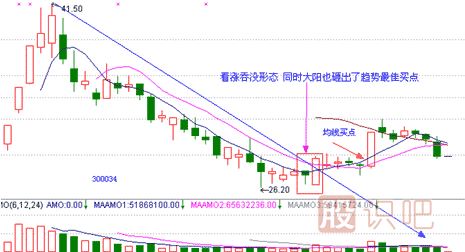 均線:吞沒形態(tài)出現(xiàn)后,均線系統(tǒng)配合出現(xiàn)金叉或者死叉,效果也能夠得到更好的確認。
