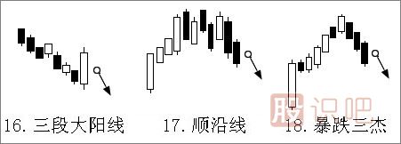 此處所稱的順沿線是指自高檔順次而下出現(xiàn)的二根陰線。為了打擊此二根陰線所出現(xiàn)的一大根陽(yáng)線,看起來(lái)似乎買盤力道增強(qiáng)了,但投資人須留意這只不過(guò)是根“障眼線”,主力正在拉高出貨,也是投資人難得的逃命線,宜做空。