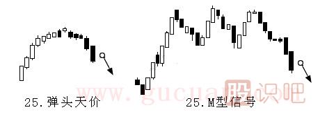 所謂M字型(或稱倒W型)系指行情出現(xiàn)第一次天價(jià)后,開始回跌,當(dāng)?shù)诙蜗蛱靸r(jià)挑戰(zhàn)時(shí),卻因大量賣盤涌現(xiàn),無(wú)法突破第一次天價(jià)價(jià)位,在第一次天價(jià)價(jià)位附近形成第二次天價(jià),然后下跌。這種形態(tài)類似英文字母“M”,故稱“M字型”。這是明顯的賣出信號(hào)