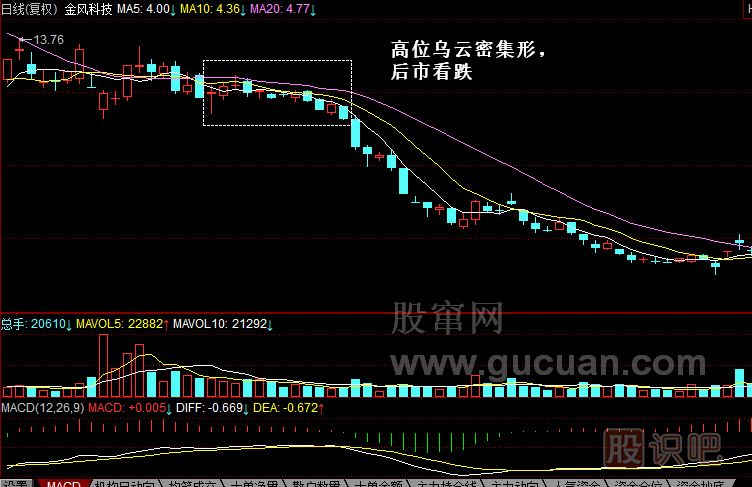 實例:美克家居股價在經(jīng)過一輪上行之后迎來調(diào)整,于2013年5月10日再次上行,但第二交易日高開低走,最終形成烏云蓋頂形態(tài),之后股價大幅下行。