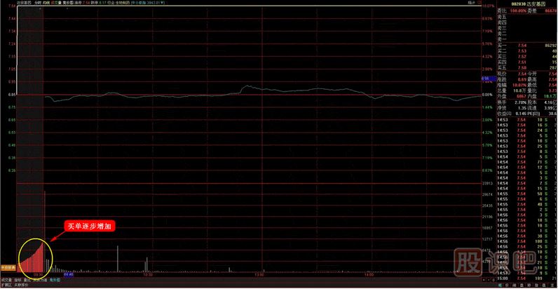 ⑤關注攻擊波所對應的每筆成交單是否較大、較密,成交單越大,成交密度越高則后期拉升的動力越強勁,反之,則越弱。